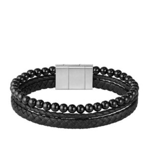 Ανδρικό Βραχιόλι Χειροπέδα δερμάτινη BOSS από ανοξείδωτο ατσάλι σε ασημί-μαύρο χρώμα SKU 1580786