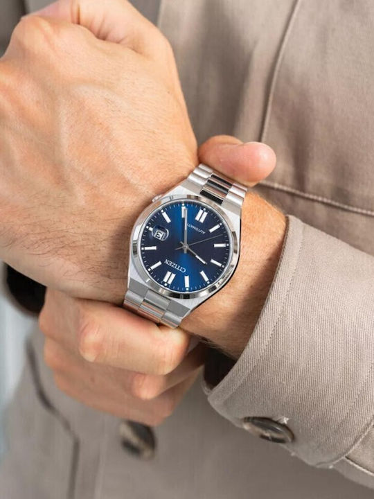 Ανδρικό ρολόι του brand Citizen, σειράς Tsuyosa, με μεταλλικό ασημί μπρασελέ και μπλε καντράν. Ιδανικό για όσους εκτιμούν την κομψότητα σε κάθε λεπτομέρεια, αυτό το ρολόι είναι μια διαχρονική επιλογή που συνδυάζει στυλ και λειτουργικότητα.