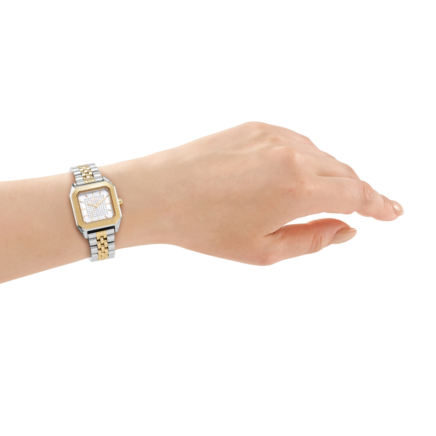Γυναικείο ρολόι DKNY, από τη συλλογή Signature Shape, με διάμετρο κάσας 27 x 34 mm, πλαίσιο και μπρασελέ από δίχρωμο ανοξείδωτο ατσάλι.