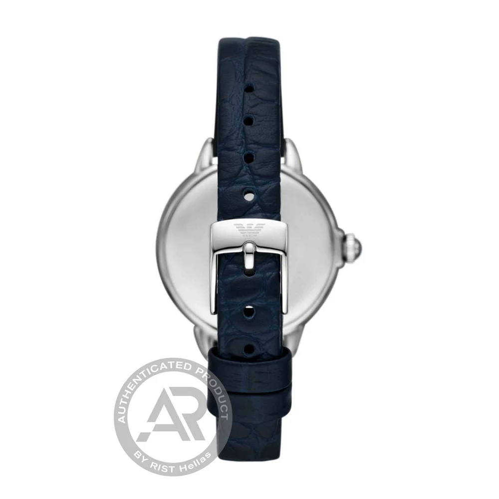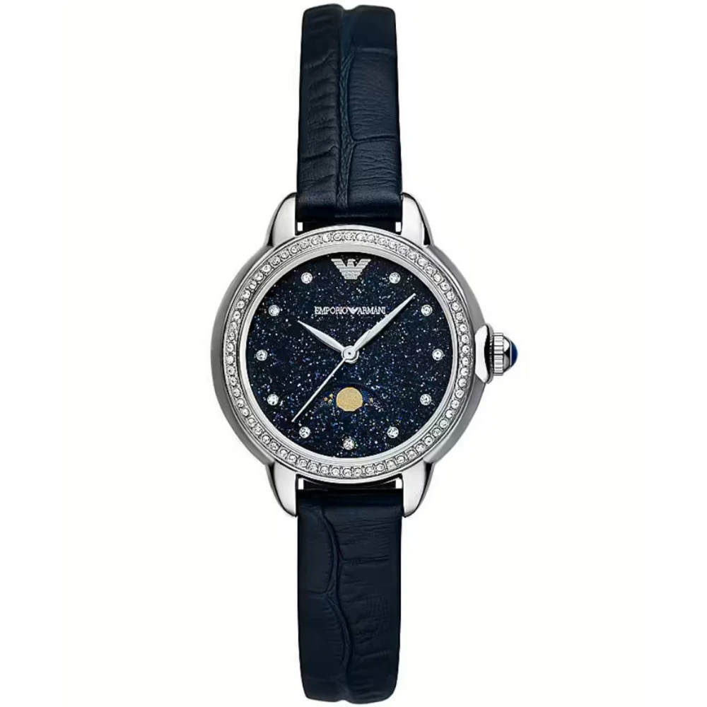 Το Emporio Armani AR11629 είναι ένα γυναικείο ρολόι Pro-Planet / Mia “Starry Night” με κάσα 32 mm από ανοξείδωτο ατσάλι και μπλέ καντράν (blue sandstone finish).  Διαθέτει μηχανισμό quartz, με ένδειξη φάσης σελήνης (moonphase), κρύσταλλο mineral, δερμάτινο λουράκι μπλε και αντοχή στο νερό έως 5 ATM (Πλύσιμο χεριών / Κρύο ντους)