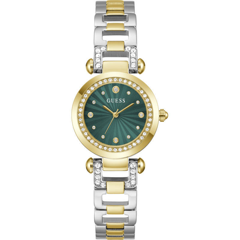 Γυναικείο ρολόι διαμέτρου 30mm με μηχανισμό QUARTZ ακριβείας. Έχει πράσινο καντράν με διαφανείς πέτρες και επίχρυσους δείκτες. Η κάσα του είναι από ανακυκλωμένο ατσάλι με χρυσές λεπτομέρειες. Έχει ασημένιο – χρυσό μπρασελέ από ανακυκλωμένο ατσάλι και κούμπωμα ασφαλείας. Είναι αδιάβροχο (3 ΑΤΜ).