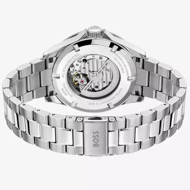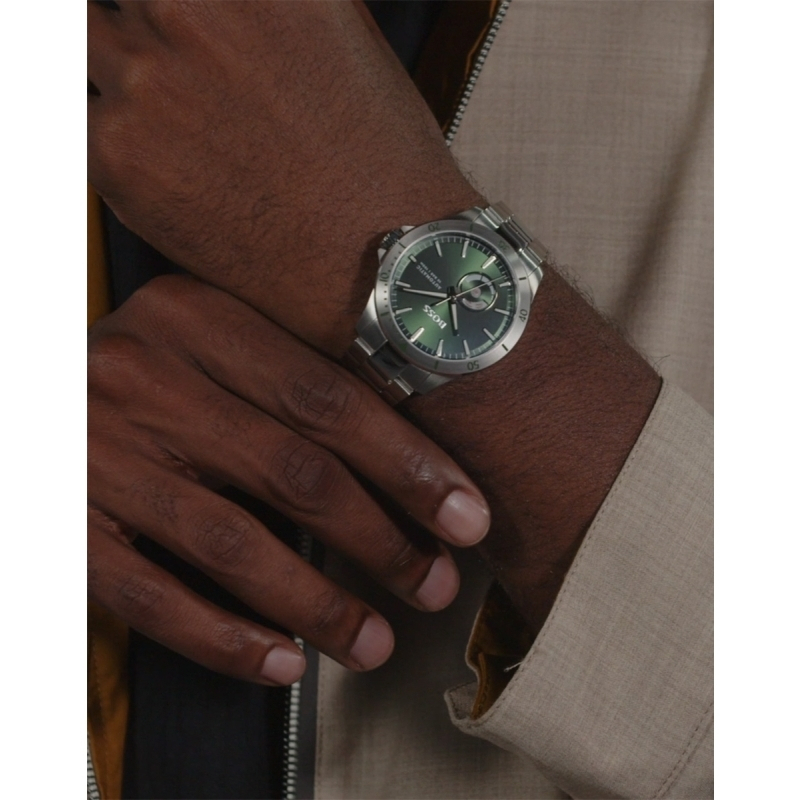 Ανδρικό αυτόματο ρολόι της εταιρίας Boss με πράσινο καντράν και μπρασελέ σε ασημί χρώμα.