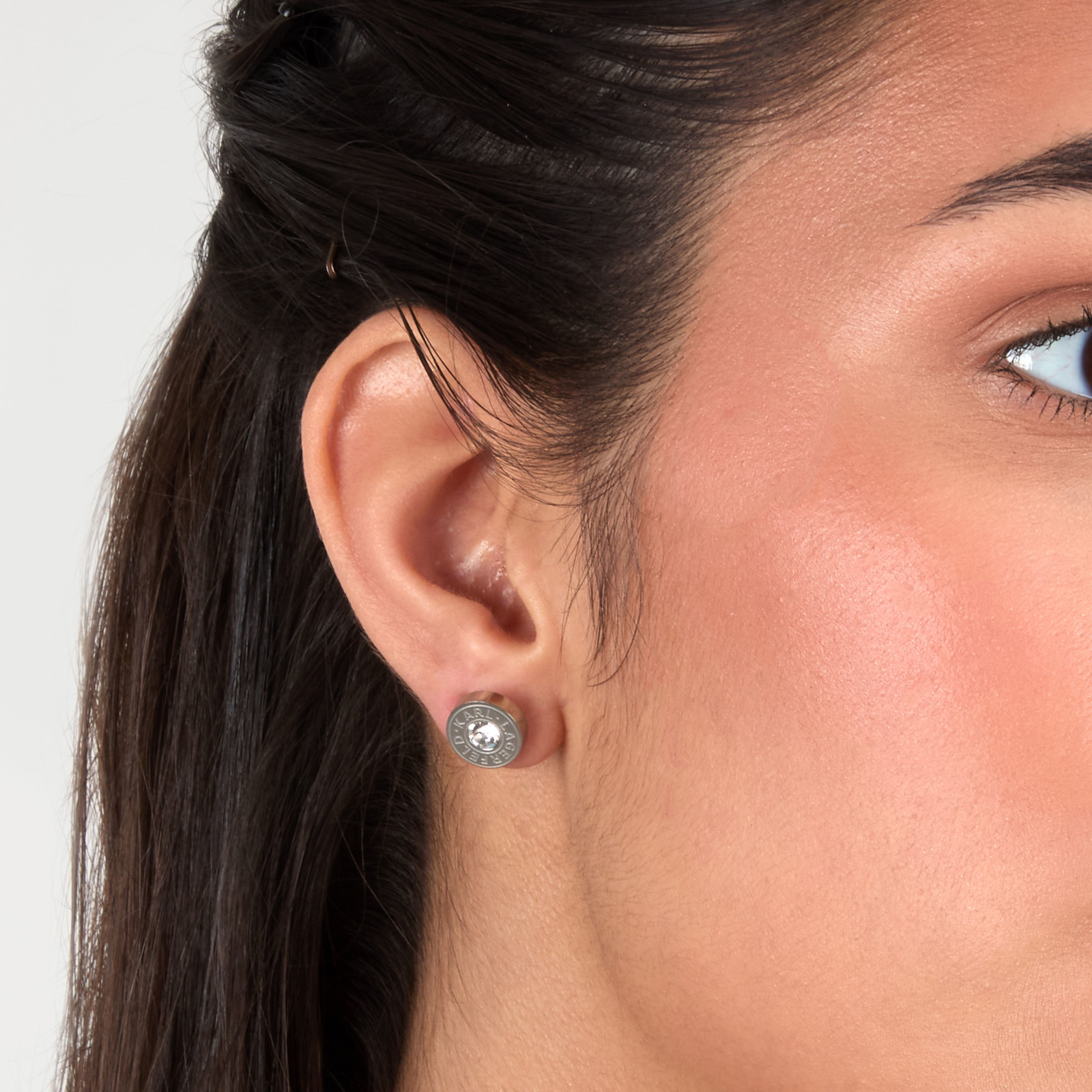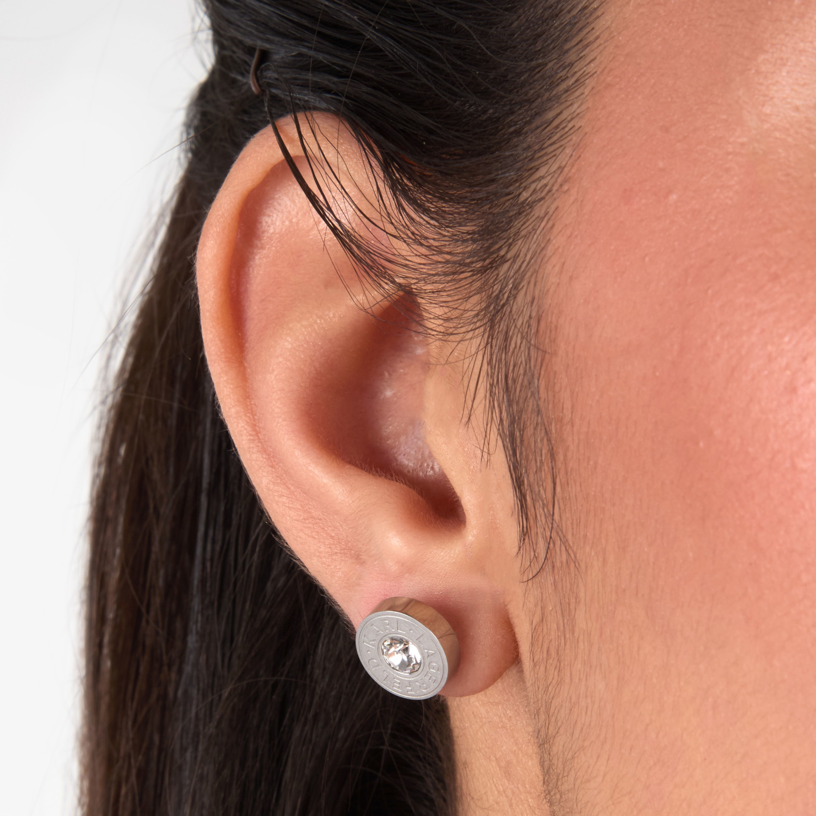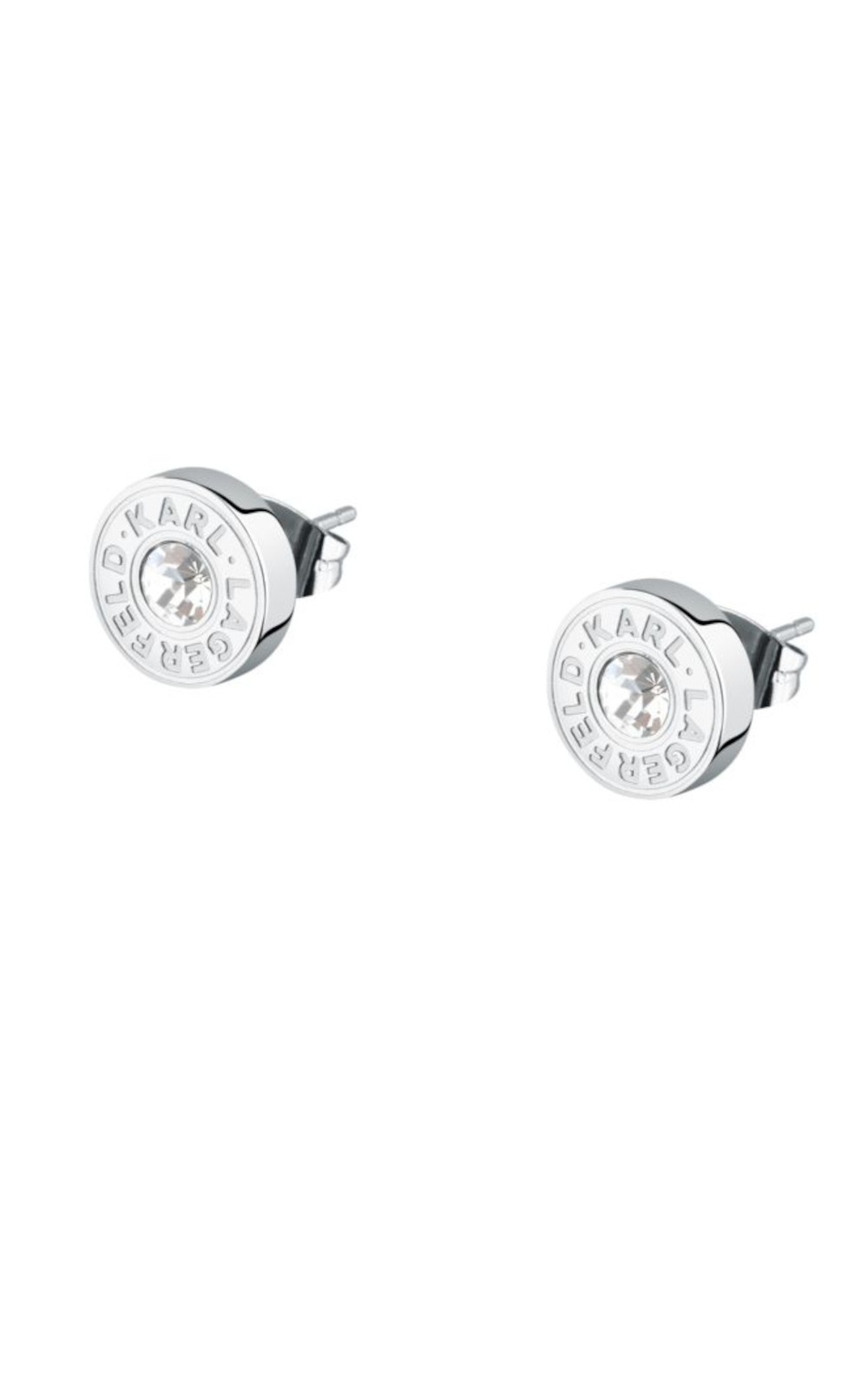 Γυναικεία σκουλαρίκια KARL LAGERFELD ασημένιου χρώματος. Είναι κατασκευασμένα από ανοξείδωτο ατσάλι και είναι διακοσμημένα με πέτρες(1cm).