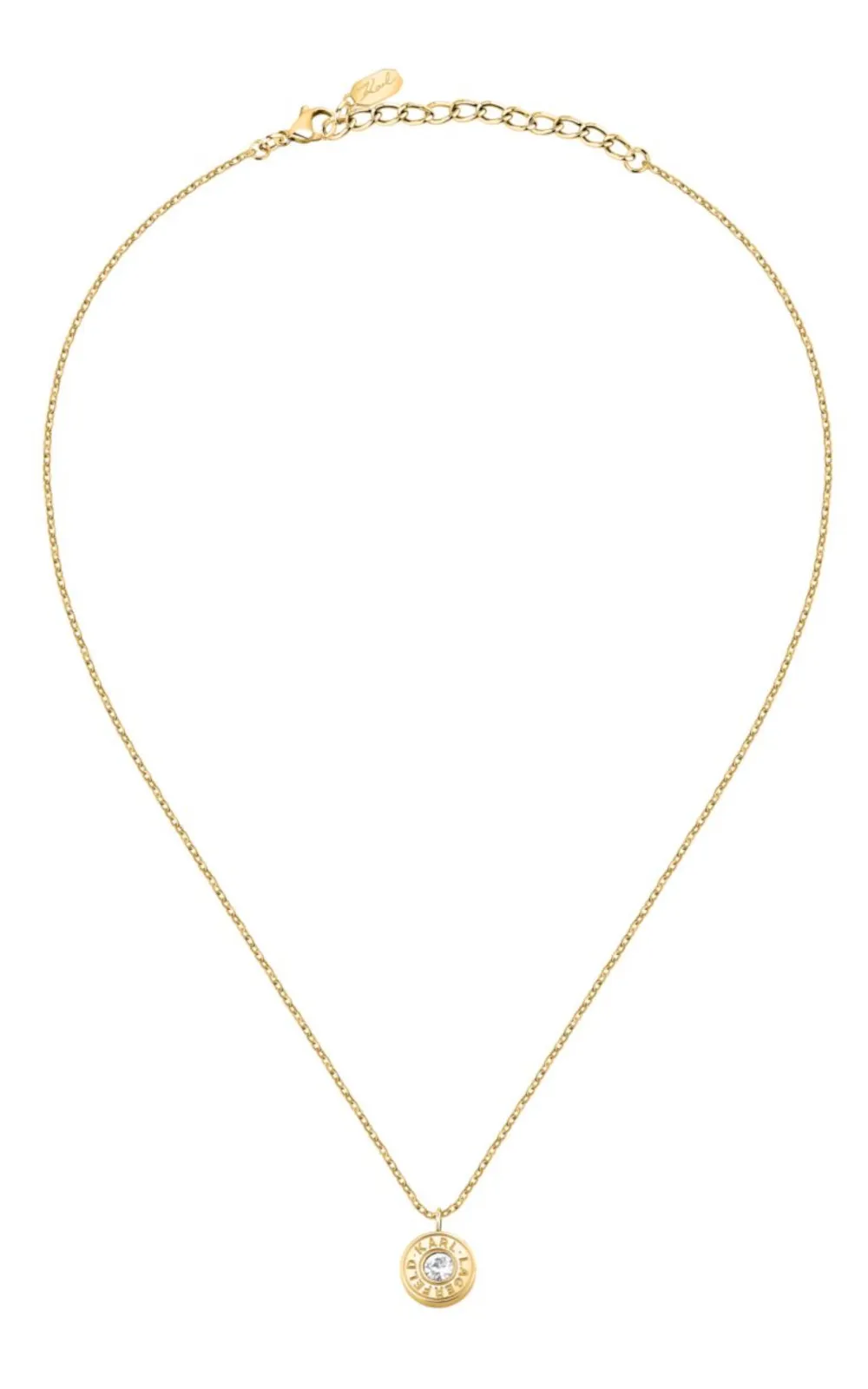 Γυναικείο κολιέ KARL LAGERFELD χρυσού χρώματος με πέτρα. Είναι κατασκευασμένο από ανοξείδωτο ατσάλι και είναι διακοσμημένο με σχέδιο με άσπρη πέτρα και λογότυπο της εταιρείας(40+5cm). Συνοδεύεται από κουτί συσκευασίας KARL LAGERFELD και ΕΓΓΥΗΣΗ 2 ΕΤΩΝ της επίσημης αντιπροσωπείας KARL LAGERFELD.