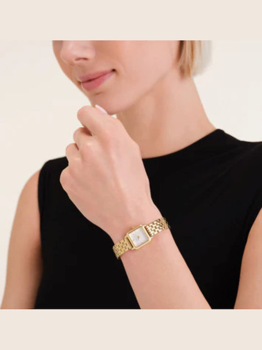 Αυτό το ρολόι Rosefield αποπνέει διαχρονική κομψότητα, σχεδιασμένο εξ ολοκλήρου από ανοξείδωτο ατσάλι με λαμπερό χρυσό φινίρισμα. Το τετράγωνο καντράν του σε απαλό λευκό χρώμα ενισχύει τη minimal αισθητική, με λεπτούς δείκτες και διακριτικές ενδείξεις που τονίζουν την απλότητά του.
