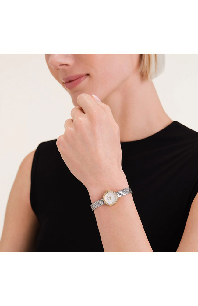 Κατασκευασμένο από ανοξείδωτο ατσάλι και διακοσμημένο με πέτρες ζιργκόν στην στεφάνη του, αυτό το ρολόι αποτελεί την τέλεια προσθήκη σε οποιαδήποτε συλλογή αξεσουάρ, προσφέροντας στυλ, άνεση και διαχρονικότητα.
