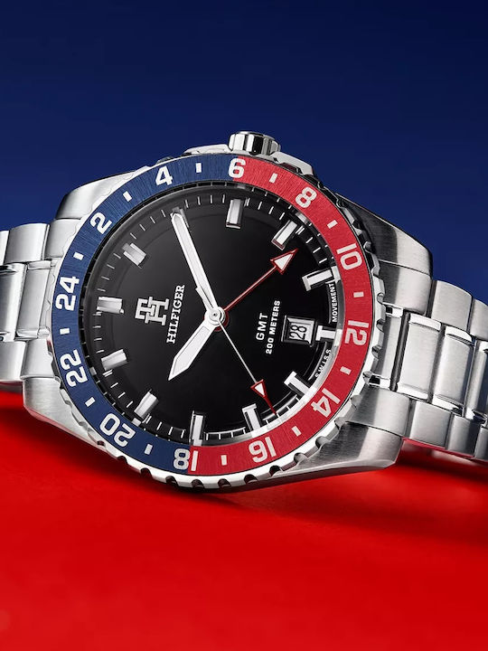 Aνδρικό ρολόι Tommy Hilfiger από ανοξείδωτο ατσάλι με μαύρο καντράν και ασημί μπρασελέ.